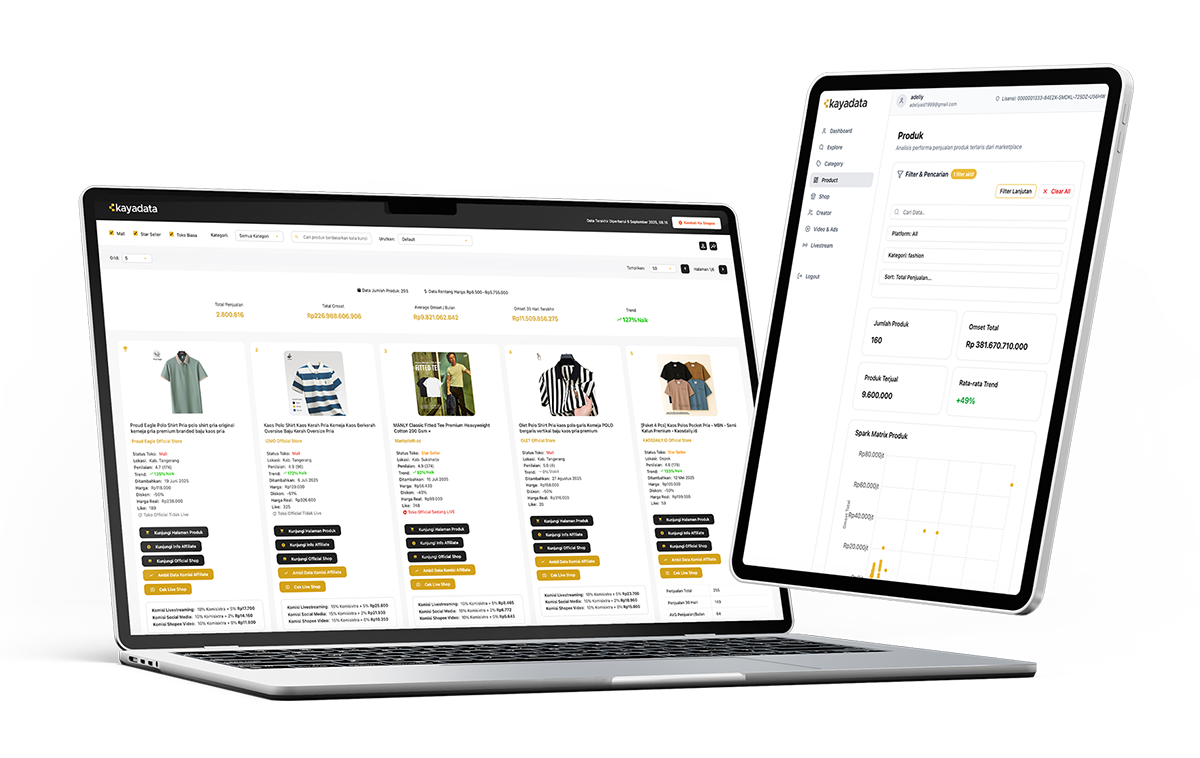 Dengan Kayadata, kamu langsung tahu produk mana yang sedang meledak, kompetitor mana yang harus disikat, strategi apa yang bisa bikin penjualan toko Kamu naik gila-gilaan, Cek produk affiliate dengan komisi paling cuan — semua dari data realtime Shopee, bukan tebak-tebakan.
